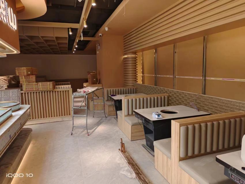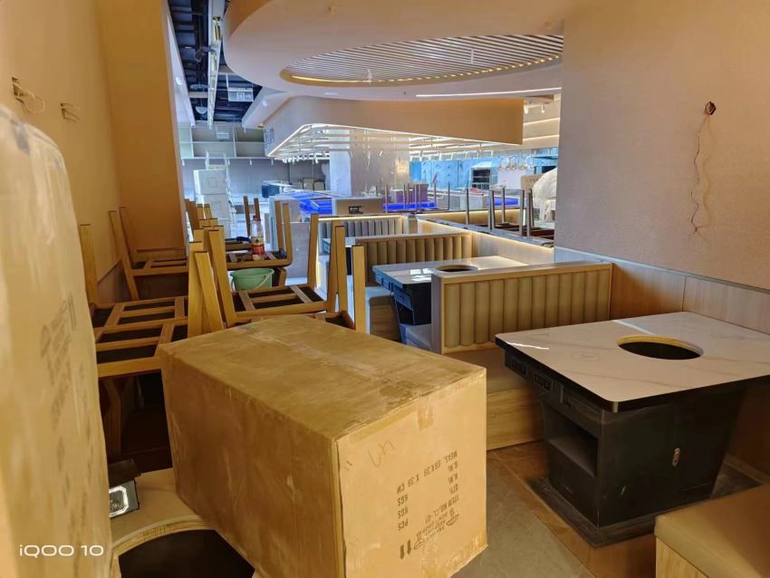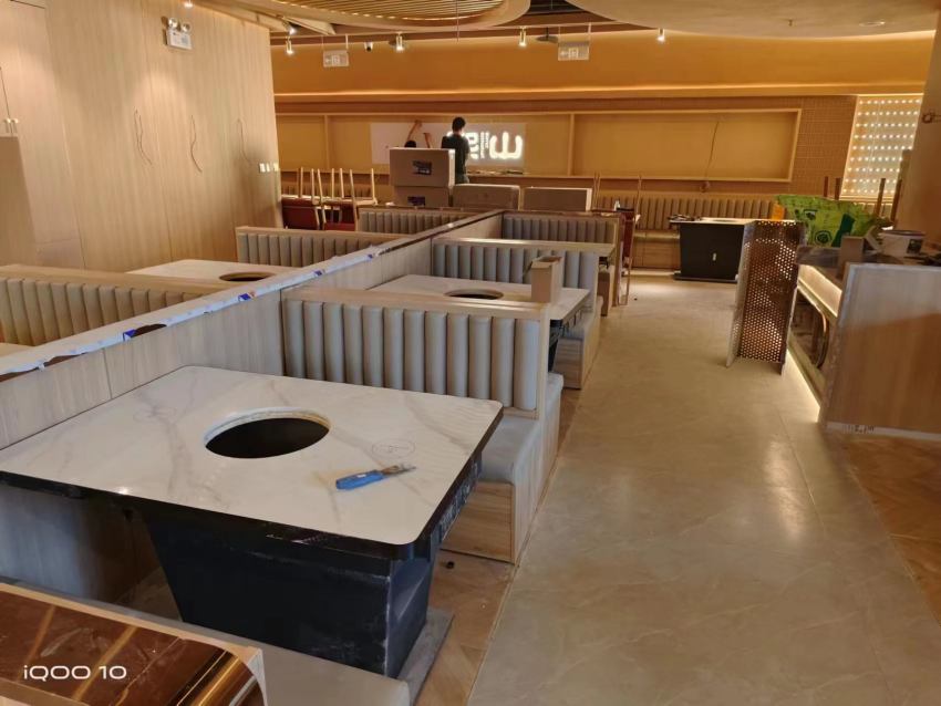 以下圖片是來(lái)自西安博菲克家具廠售后安裝部的伙伴在漢熙山料理級(jí)海鮮自助烤肉餐廳交貨的場(chǎng)景,工人將卡座沙發(fā)按照布局圖要求一一組裝擺放到位,為確保客戶試營(yíng)業(yè)不受影響連續(xù)作戰(zhàn),圓滿完成了全部餐桌椅安裝。